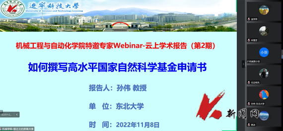 11月8日,应ayxty.com机械工程与自动化学院邀请,东北大学机械工程与自动化学院孙伟教授通过线上形式,为机械学院全体教师作题为《如何撰写高水平国家自然科学基金申请书》的报告。