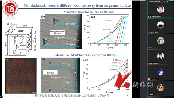 近年来,仪器化压入和划入是表征材料表面微观力学性能的重要方法,可获得材料微小区域的纳米硬度、弹性模量、残余应力、断裂韧度、屈服强度、硬化指数等关键性能指标。刘明结合多年研究积累,基于大量应用案例,详细介绍利用仪器化压入表征喷丸强化层残余应力分布、硬脆材料的断裂韧度;利用仪器化划入表征材料的断裂韧度、涂层的抗划擦性能。报告内容新颖、应用案例具体,指导性强,激起广大研究生浓厚兴趣。报告会后,刘明与研究生就纳米硬质薄膜的强韧性能评测等问题进行深入交流和探讨。