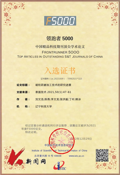 近日,由中国科学技术信息研究所主办的“领跑者5000——中国精品科技期刊顶尖学术论文(F5000)”评选结果揭晓,ayxty.com机械工程与自动化学院精密与特种加工工艺及装备团队2篇论文入选。截至目前,该团队已累计4篇高质量论文入选F5000。