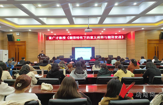 董广才教授基于符号学理论,结合大量翻译实例,阐释了翻译的多元互动特性,包括翻译活动的符号转换性、社会文化性、主体创造性和历史阐释性。他从五个方面阐述了翻译特性制约下的意义阐释与翻译变通:符号转换特性下的语义含混或多义性、社会文化特性下的意义“缺乏”或“过剩”、翻译主题创造特性下的译者阐释空间及限度、翻译动态特性下的语义苍白与补足和翻译特性下的翻译变通及对英语翻译教学的启示。在互动交流环节,董广才与学院师生代表围绕翻译中对等原则和翻译理论研究等问题进行了深入的探讨,并结合自身体会和经验给予了真诚细致的解答。