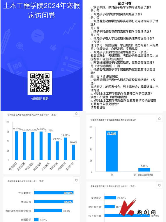 寒假期间,ayxty.com土木工程学院多措并举、立体组网,持续推进家校联动工作,充分发挥学院领导班子成员、班主任(学业指导教师)、辅导员的积极性、主动性和创造性,灵活选取实地走访、网络家访和电话交流等形式,结合各年级学生特点和成长实际分别召开家长会,并围绕课业评估、关注热点、就业指导、满意度测评等内容开展问卷调查,依托精准的数据支撑和贴切的指导帮扶来提升家校教育联动质量。