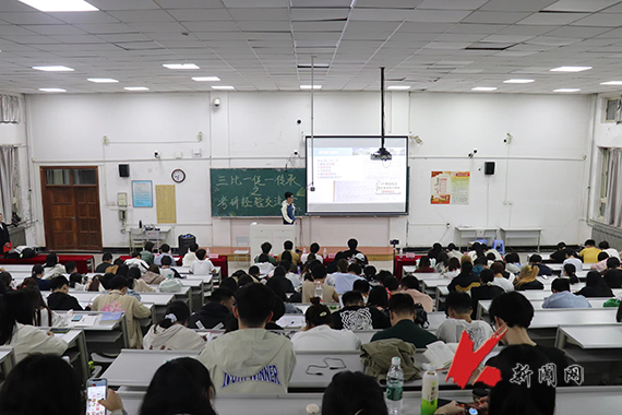 交流会上,6名学生从不同角度讲述了他们的考研故事,分享了他们的考研经验。考入天津大学的董钰兴细致讲解了报考院校、专业选择,以及如何制定各科复习计划,并为同学们推荐了许多实用的考研复习小程序和网上复习资料。考入厦门大学的温嘉琪告诉学弟学妹在备考过程中一定要按部就班执行复习计划,英语要注重听说读写的全面提升,数学要善于总结题型和解题方法,政治要多关注重要会议和政策。她说,成功“上岸”的法宝离不开良好健康的心态,大家要学会调整心态,积极应对压力。其他4名学生从考研目标确立、各科复习备考策略、心态调整及面对挑战时的应对方法等方面进行了分享。