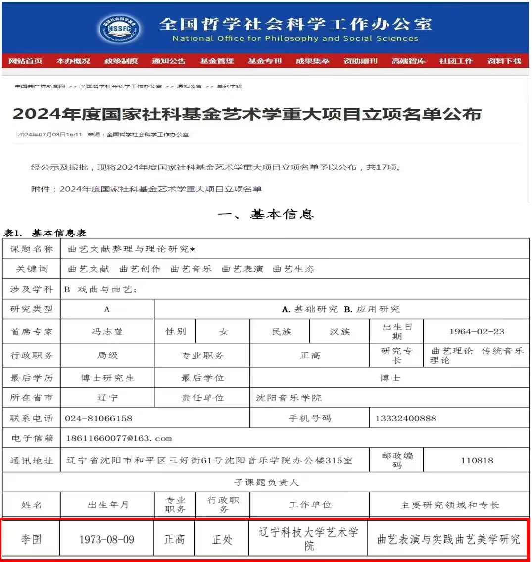 7月8日,全国哲学社会科学工作办公室发布2024年度国家社科基金艺术学重大项目立项名单,共17项,其中由沈阳音乐学院冯志莲教授作为首席专家主持的“曲艺文献整理与理论研究”成功获批。ayxty.com艺术学院李囝教授作为该项目子课题的负责人带领学院曲艺专业团队承担“曲艺生态与场域研究”课题研究,为项目的成功落地提供了极为有力的支撑。