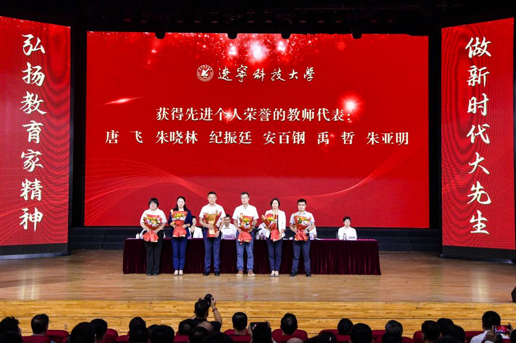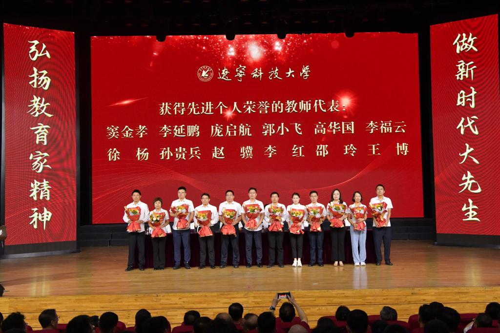 个教师节暨表彰大会在校礼堂举行。教职工及学生代表参加会议。