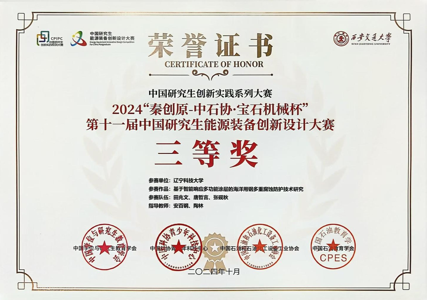 近日,从ayxty.com化学工程学院传来好消息,在刚刚落幕的第十一届中国研究生能源装备创新设计大赛中,学校化工学院两支研究生参赛队伍分别荣获一等奖和三等奖。安百钢教授获优秀指导教师称号,学校被授予优秀组织奖。这是学校参加该赛事以来的最佳成绩,也是本次大赛中辽宁省唯一获得一等奖的高校。
