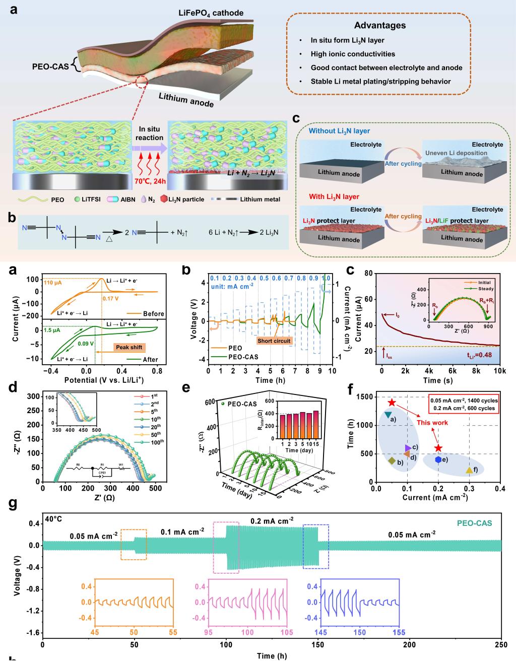 -1)和超低的电化学势 (−3.04 V vs SHE)备受关注,然而在实际应用过程中,由于其界面不稳定性等原因仍面临巨大挑战。安百钢教授团队与学校特聘教授,南京理工大学孙呈郭教授合作,利用原位热分解2,2-偶氮二异丁腈 (AIBN)添加剂,在聚合物固态电解质与金属锂负极之间构建了一种稳定高效的氮化锂 (Li