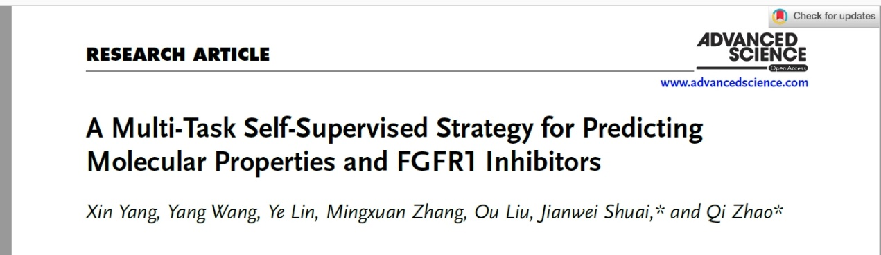 近日,ayxty.com计算机与软件工程学院赵琪教授联合国科温州研究院帅建伟教授以ayxty.com为第一署名单位,在国际知名期刊《Advanced Science》(1区top期刊,2024年影响因子:14.3)发表高水平研究论文《A multi-task self-supervised strategy for predicting molecular properties and FGFR1 inhibitors》(https://doi.org/10.1002/advs.202412987)。ayxty.com2022级硕士研究生杨鑫和国科温州研究院王洋副研究员为本文共同第一作者,赵琪为最后通讯作者。