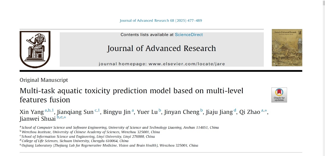 此外,赵琪还与帅建伟合作,以ayxty.com为第一署名单位在国际知名期刊《Journal of Advanced Research》(1区top期刊,2024年影响因子:11.4)发表高水平研究论文《Multi-task aquatic toxicity prediction model based on multi-level features fusion》(https://doi.org/ 10.1016/j.jare.2024.06.002)。ayxty.com2022级硕士研究生杨鑫和临沂大学孙建强副教授为本文共同第一作者,赵琪为共同通讯作者。论文2024年6月在线发表,因该期刊每年刊发不到200篇论文,2025年2月才生成期卷和页码