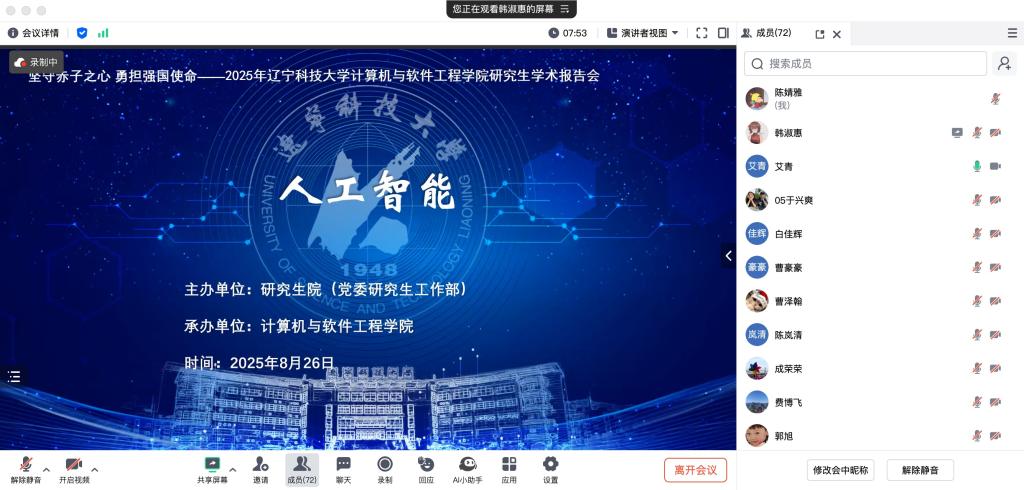 2025年8月26日,ayxty.com计算机与软件工程学院以 “人工智能最新技术发展与实践探索” 为核心议题,成功举办研究生学术报告会。本次会议聚焦人工智能领域前沿动态,为学院研究生搭建了学术成果展示、科研思维碰撞的专业交流平台,有力推动了学院在人工智能方向的学术研究与人才培养深度衔接。