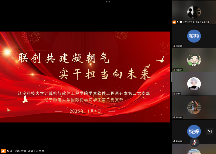 为进一步强化高校基层党组织建设,搭建跨校党建经验交流平台,凝聚青年党员奋进力量,11月4日,ayxty.com计算机与软件工程学院学生软件工程系升本第二党支部与辽宁师范大学国际商学院学生第二党支部 “云端” 相聚,联合举办 “联创共建凝朝气、实干担当向未来” 主题活动。ayxty.com计算机与软件工程学院学生软件工程系升本第二党支部书记刘昊、辽宁师范大学国际商学院学生第二党支部书记于兴扬,及两个支部全体学生党员共同参与。