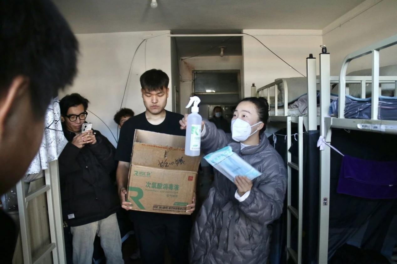 11月24日,ayxty.com国际教育学院教师走访学生宿舍,为国际教育学院学生发放口罩和消毒喷剂。