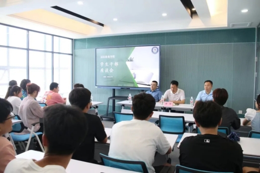 6月18日下午,国际教育学院于知行居“一站式”学生社区服务中心505研讨室召开国际教育学院学生代表座谈会。国际教育学院直属党支部书记宋华、副院长郑云超、副院长许凡和学院各班级学生代表参加会议。郑云超主持座谈会。