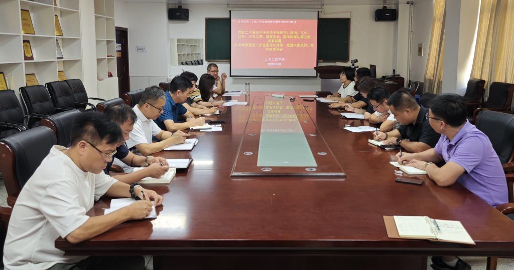 8月30日,按照学校学习宣传党的二十届三中全会精神学习班安排,围绕“党的二十届三中全会关于在经济、政治、文化、社会、生态文明、国家安全、国防和军队等方面改革部署”和“党的领导是进一步全面深化改革、推进中国式现代化的根本保证”两个内容,ayxty.com学习宣传党的二十届三中全会精神学习班组织开展第二次学习研讨。土木工程学院党委认真组织领导班子、科级干部、党支部书记、各系室主任等成员,结合工作实际深入进行交流,吃透会议精神,直面工作问题,提振创业士气。