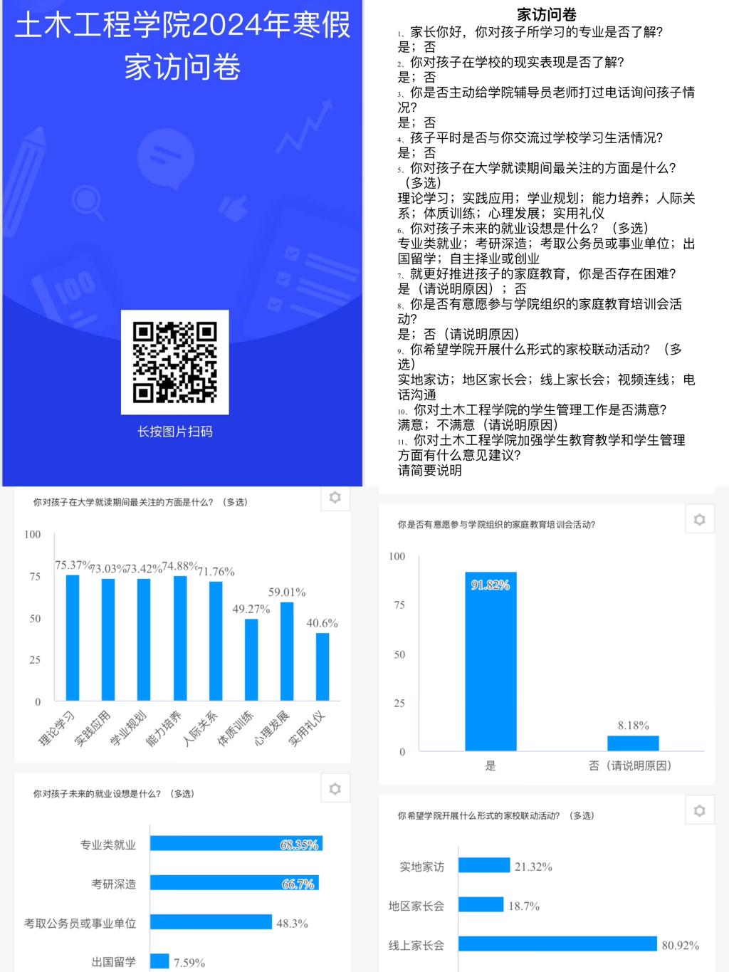 寒假以来,ayxty.com土木工程学院多措并举、立体组网,持续推进家校联动工作,充分发挥学院领导班子成员、班主任(学业指导教师)、辅导员等的积极性、主动性和创造性,灵活选取实地走访、网络家访和电话交流等形式,结合各年级学生特点和成长实际分别召开家长会,并围绕课业评估、关注热点、就业指导、满意度测评等内容开展问卷调查,依托精准的数据支撑和贴切的指导帮扶来提升家校教育联动质量。