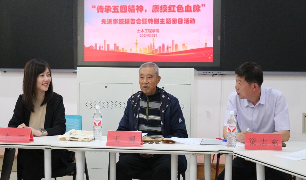 5月24日,ayxty.com土木工程学院、校关工委在博学楼C213联合举办“传承五四精神,赓续红色血脉”先进事迹报告会暨特别主题团日活动。活动特别邀请95岁高龄的抗美援朝老兵王竭老先生作专题报告,校关工委相关负责同志,土木学院领导班子成员及师生代表参加报告会。