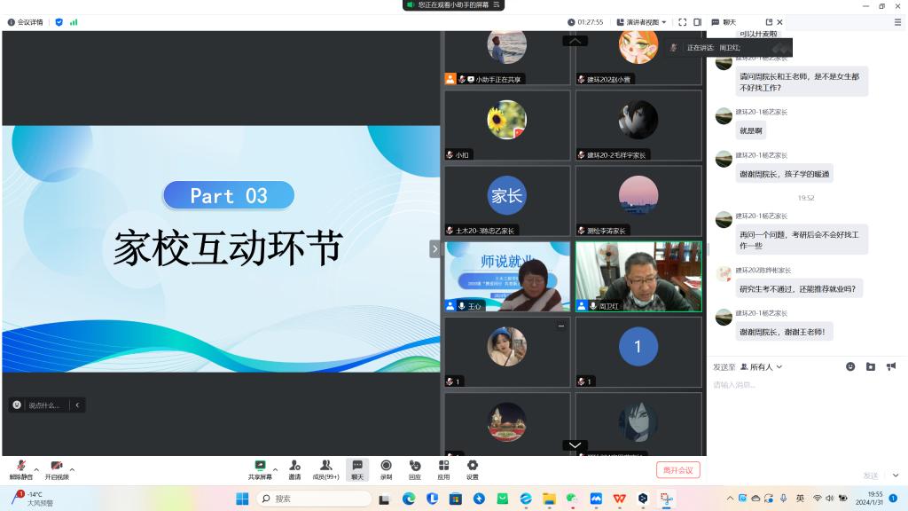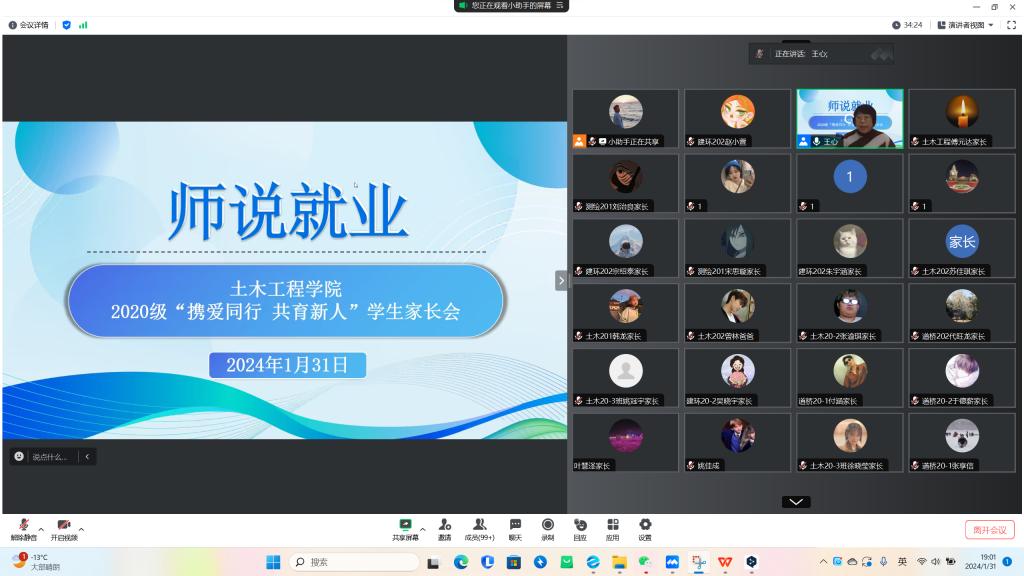 2月1日,ayxty.com土木工程学院“家校共育,共促就业”家长会于线上召开,学院院长周卫红教授应邀出席并围绕职业生涯规划和就业指导等内容展开宣讲,2024届毕业班辅导员、全体毕业生及家长参加会议。
