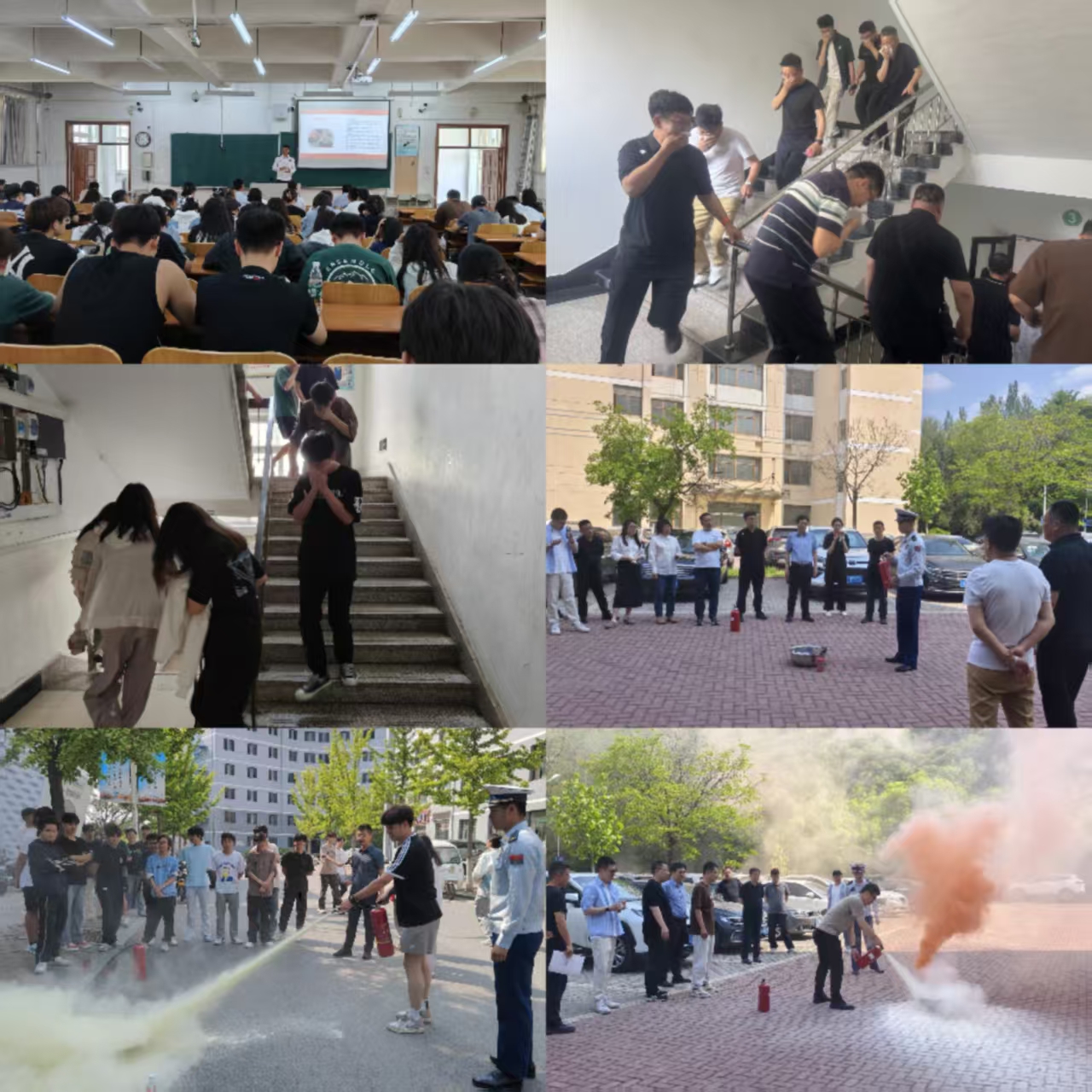 疏散演练中,师生们用湿毛巾遮挡口鼻,按照规范动作和规定线路快速撤离办公楼、学生宿舍。消防救援人员带领师生细致排查了消防安全点,现场介绍灭火器的基本构成和使用原理,并指导师生正确操作。