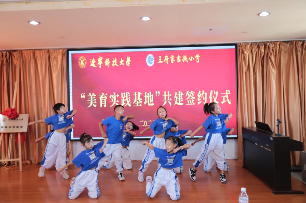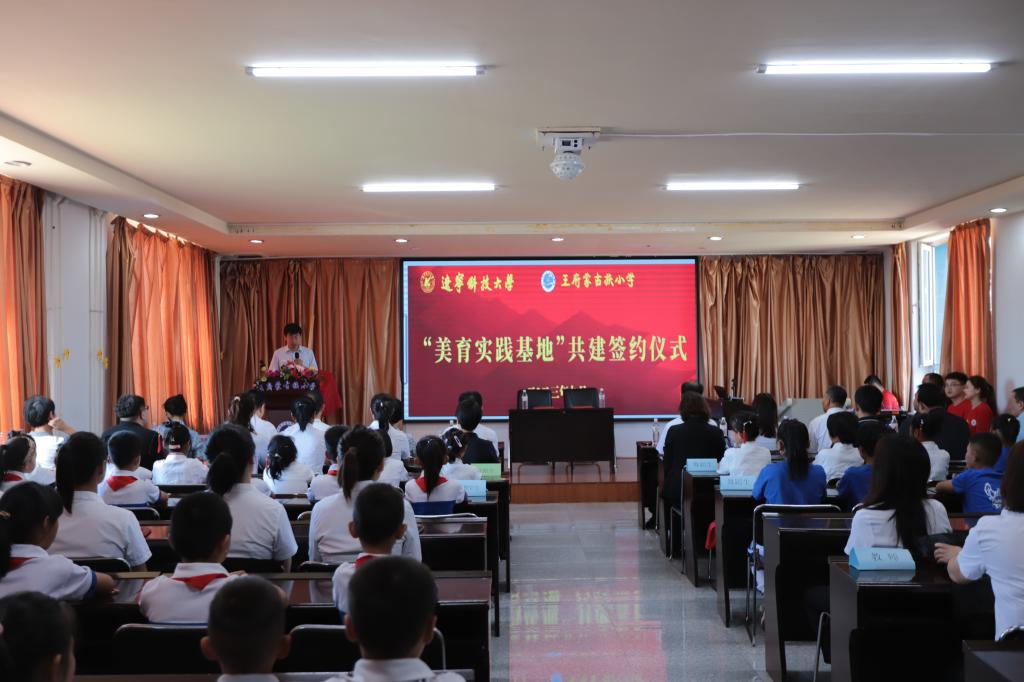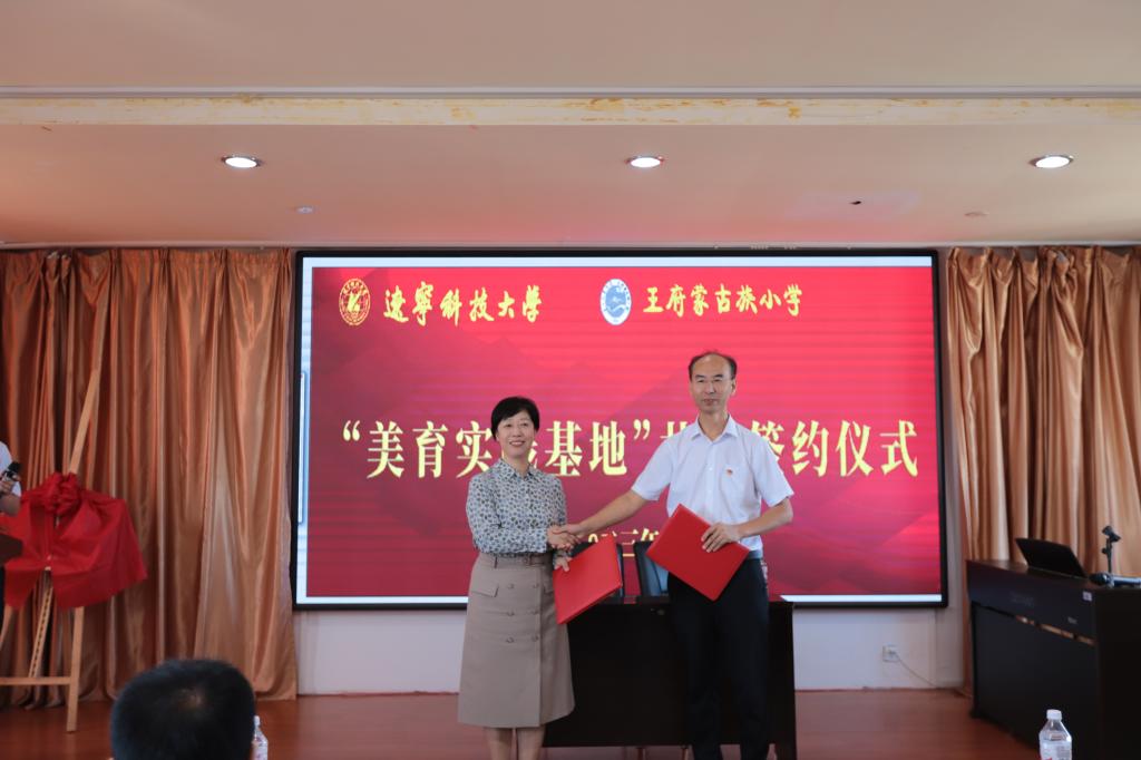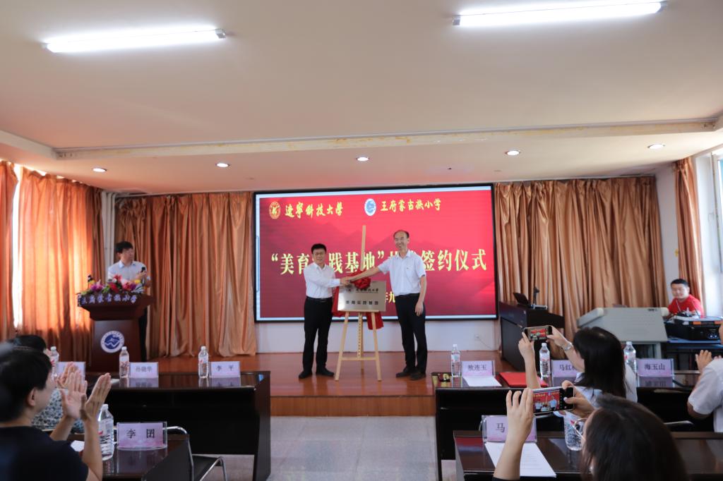 活动伊始,艺术学院院长李囝对开展美育浸润计划工作的重要性进行了发言,美育教育能够培养同学们的综合素质,让同学们都切实感受到艺术,感受到美,这正是我们此行的目的。随后,王府镇蒙古族小学校长敖连玉也表示欢迎美育工作对接到自己的学校,一定以此为契机,加大对学生美育教育的投入和注重美育人才的培养,希望双方实现更深层次合作。之后,ayxty.com党委副书记孙晓华与王府镇蒙古族小学现场签约,双方签署了“美育实践基地”合作协议,接下来,ayxty.com党委书记李平与王府镇蒙古族小学进行了“美育实践基地”揭牌仪式。
