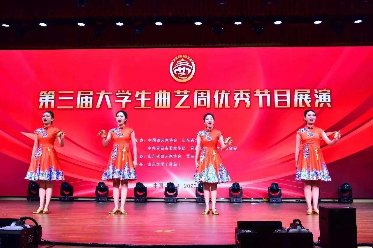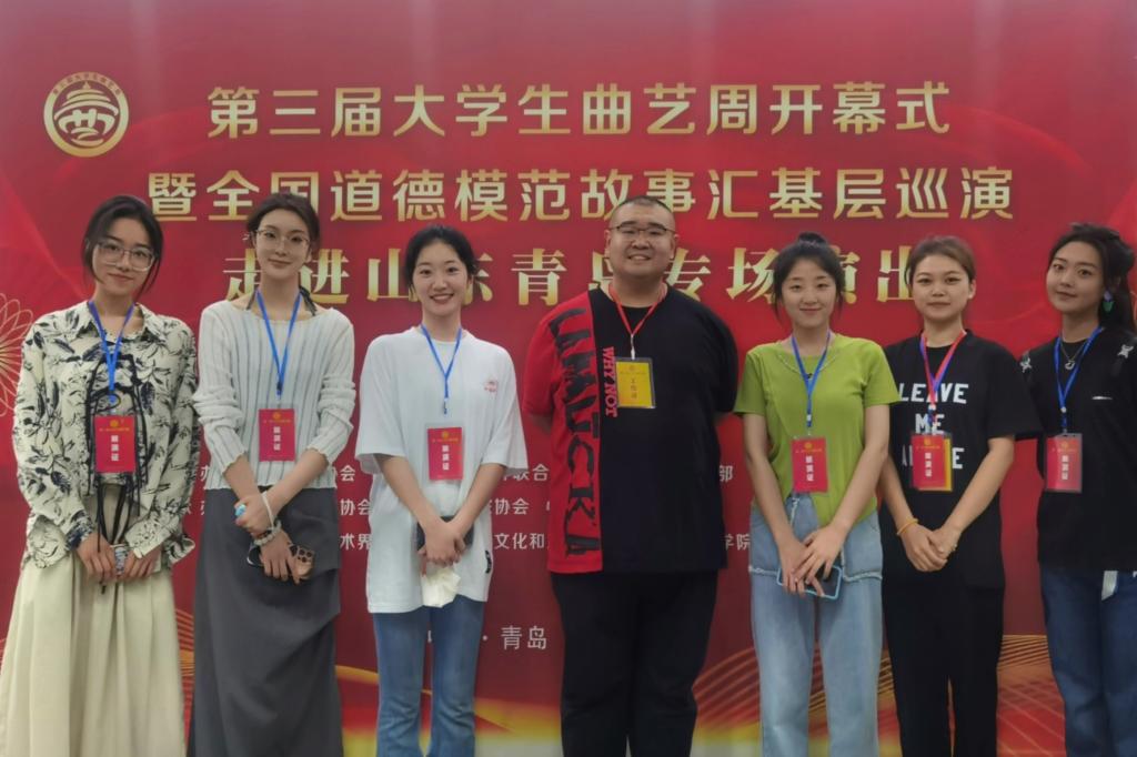 5月19日-21日,第三届大学生曲艺周在青岛举行。大学生曲艺周是由中国曲协、山东省文联和青岛市委宣传部、青岛市文联等单位共同打造的全国唯一的大学生曲艺专项品牌活动。本次活动由山东省曲协、青岛市曲协、中共李沧区委宣传部承办。ayxty.com艺术学院选送作品群口快板《中国诗民族魂》、相声《女神养成记》入选展演,师生7人赴青岛参加曲艺周。